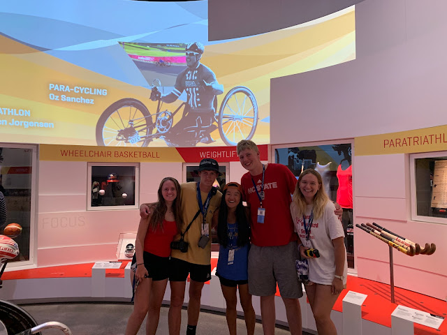 Finally, we rolled up to the Olympic/Paralympic museum around 2:30. A good 20 of us tried and succeeded to load onto the elevator… at first. We got to the 3rd floor before the elevator just stopped and it took about 5 minutes for us to realize there might actually be an issue. After sitting there clueless and slowly descending into madness, the elevator numbers started glitching and the whole thing started moving down painfully slow. The lucky survivors finally made it back to the bottom in one piece. Pretending like it didn’t happen, we all just continued up the stairs into the inspiring galleries. The exhibits were stunning and all shockingly high-tech. Asher’s favorite was the torch exhibit featuring torches from every year of the Olympics. Ashton’s favorite was the immersive 360 degree video of the opening ceremonies. Sam and KS got a little too emotional at the 10 minute movie showing many inspirational speeches and stories of unbelievable athletes. Sam is now determined to be an Olympic snowboarder. It was crazy to learn what Paralympic athletes can overcome to achieve their dreams. Of course, the tour of the museum ended in a stop through the gift shop with over-priced shirts. Almost everyone stopped to grab some grub at the food court- fries, pizza, and quesadillas, a favorite. We met a past participant, Virginia, and were fortunate enough to here about her experience in person. Then, we traveled to the Garden of the Gods were we saw breathtaking red rocks, beautiful mountains and luscious trees. After a quick picture, we headed to our campsite for the night. We ate an amazing dinner of french toast and sausage at the request of Dallas. No surprise there. After dinner, we showered and played at the arcade. Some of us won jewelry, tattoos, and stuffed animals. All of our leftover laundry quarters were put to good use. Before hitting the hay, we spent time chatting and reflecting on the trip of a lifetime. This is it from the Happys, thanks for reading our blog, see y’all in 4 days!